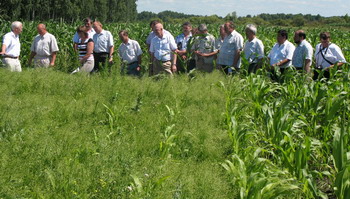 На опытных участках организаторы семинара продемонстрировали работу этих препаратов. Алексей Эдуардович отметил высокую эффективность препарата дублон голд в дозировке 70 г/га, который позволил освободить посевы кукурузы от большинства сорняков всех видов, в том числе и семейства пасленовых. Этот вариант был назван лучшим по соотношению цена – качество. А для достижения полной чистоты посевов лучшими были признаны варианты с совместным использованием почвенных и послевсходовых гербицидов, хотя такая схема и заметно дороже.